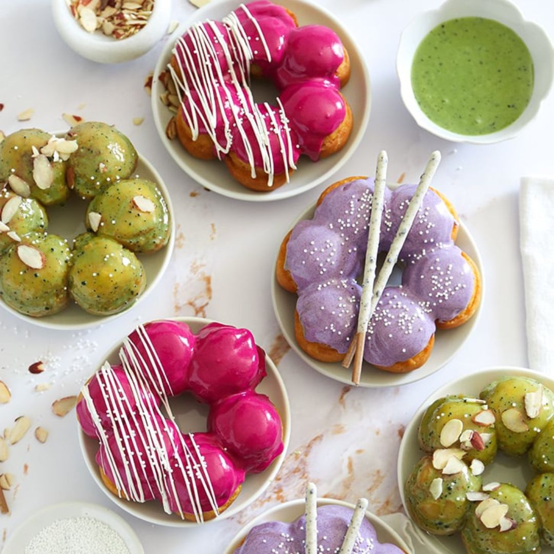 A modern ázsiai csavar: a mochi donut. Rizslisztből készül, ezért rágósabb, „chewy” állagú, mint az európai társai. Gyakran különleges ízekben – matcha, fekete szezám, yuzu – készül.