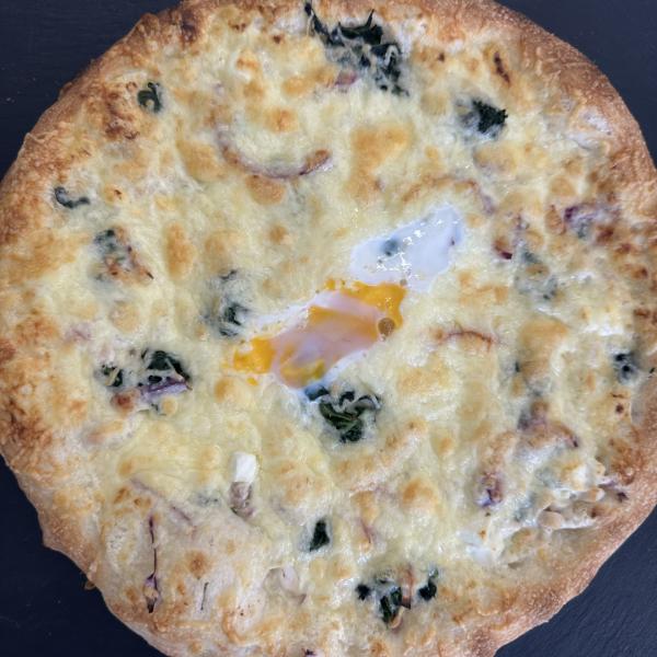 sajtkrémes alap sonka bacon lilahagyma tükörtojás trappista sajt